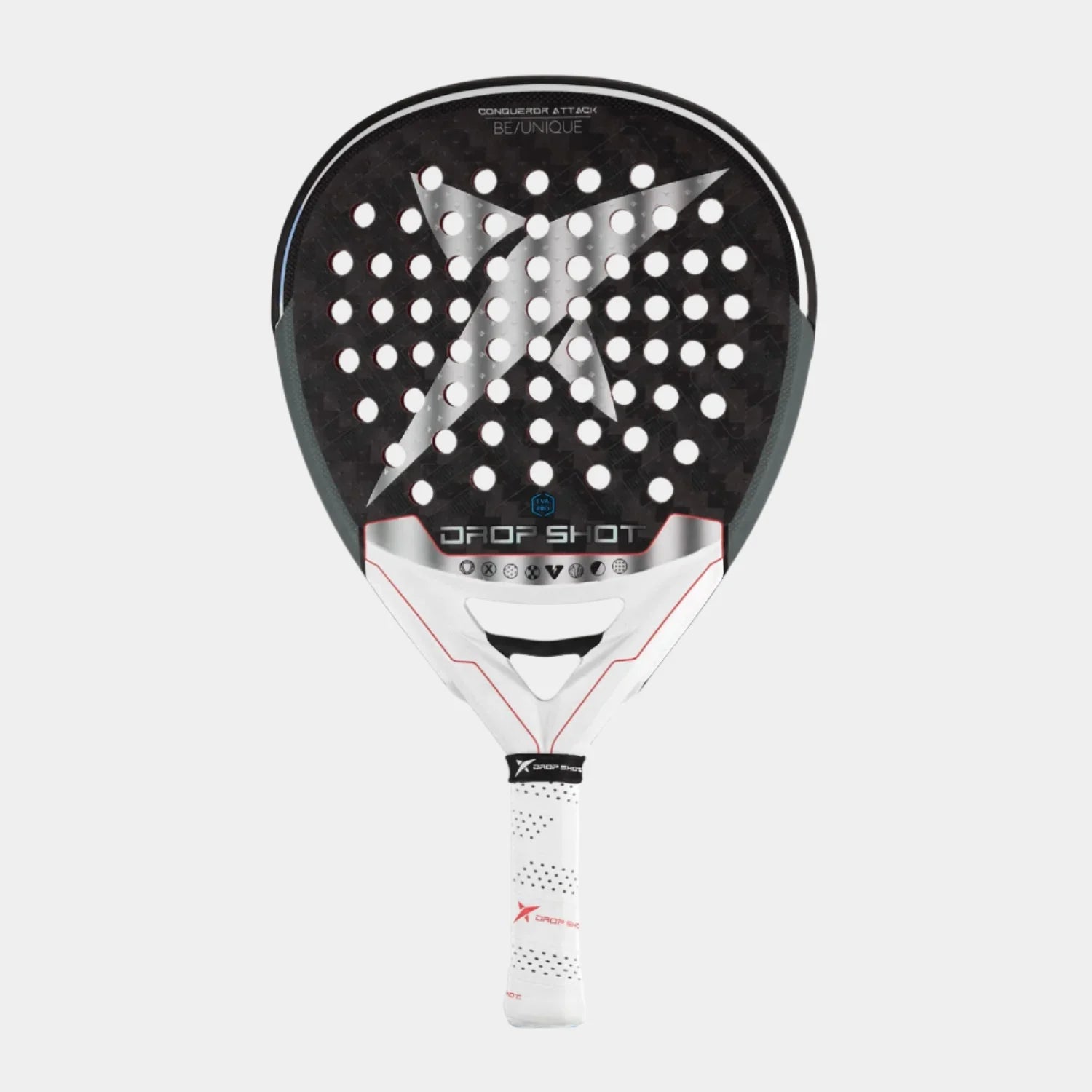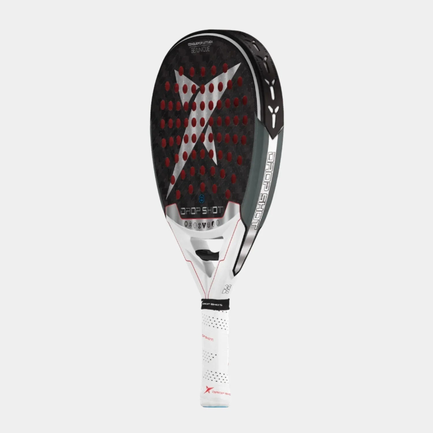 La pala Drop Shot Conqueror Attack está especialmente diseñada para jugadores avanzados que buscan control absoluto y precisión en su juego. Este modelo presume de un juego excepcional y una evolución constante en busca de la perfección. Su diseño en forma de lágrima mantiene el punto dulce ligeramente por encima del centro.