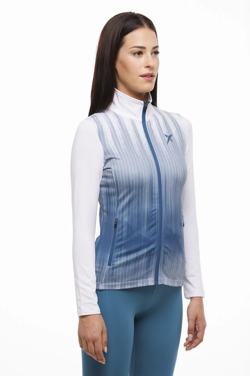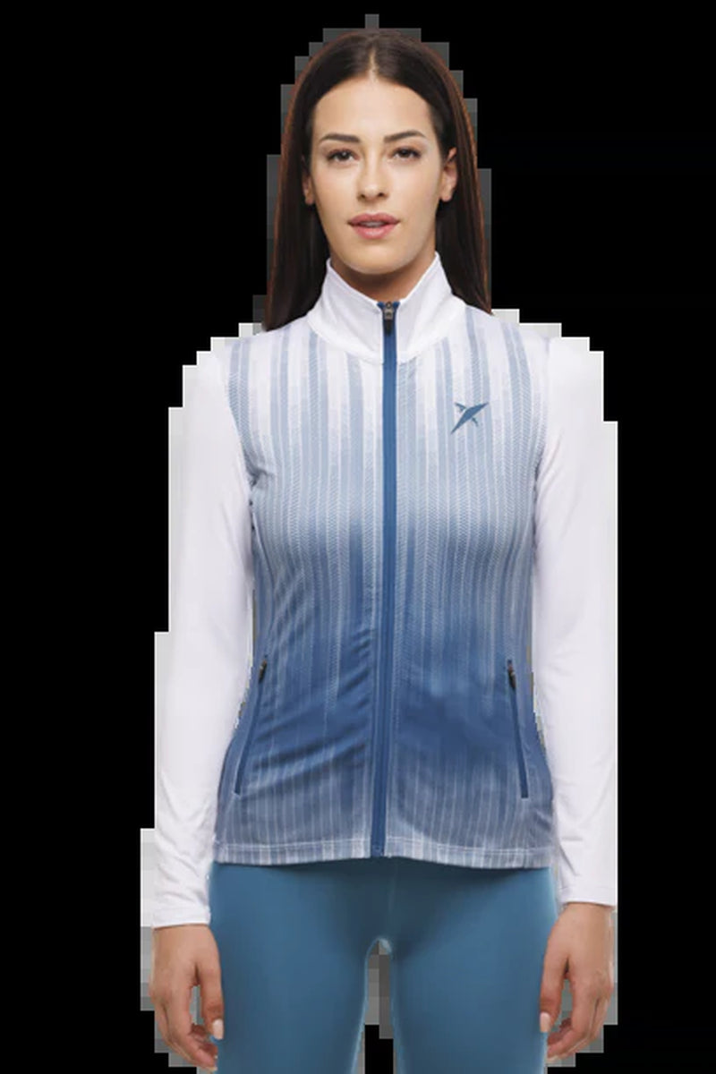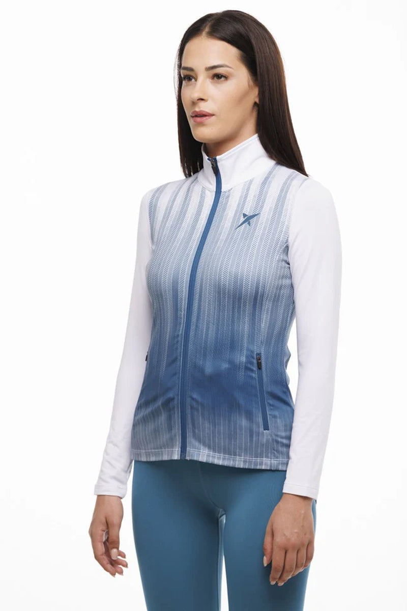 La chaqueta Drop Shot Isora realza la personalidad de las atletas y competidoras que disfrutan del pádel. La prenda presenta un degradado de tonos azules y blancos, con detalles de cremallera azules y el logotipo y el nombre de la marca impresos en silicona 3D.