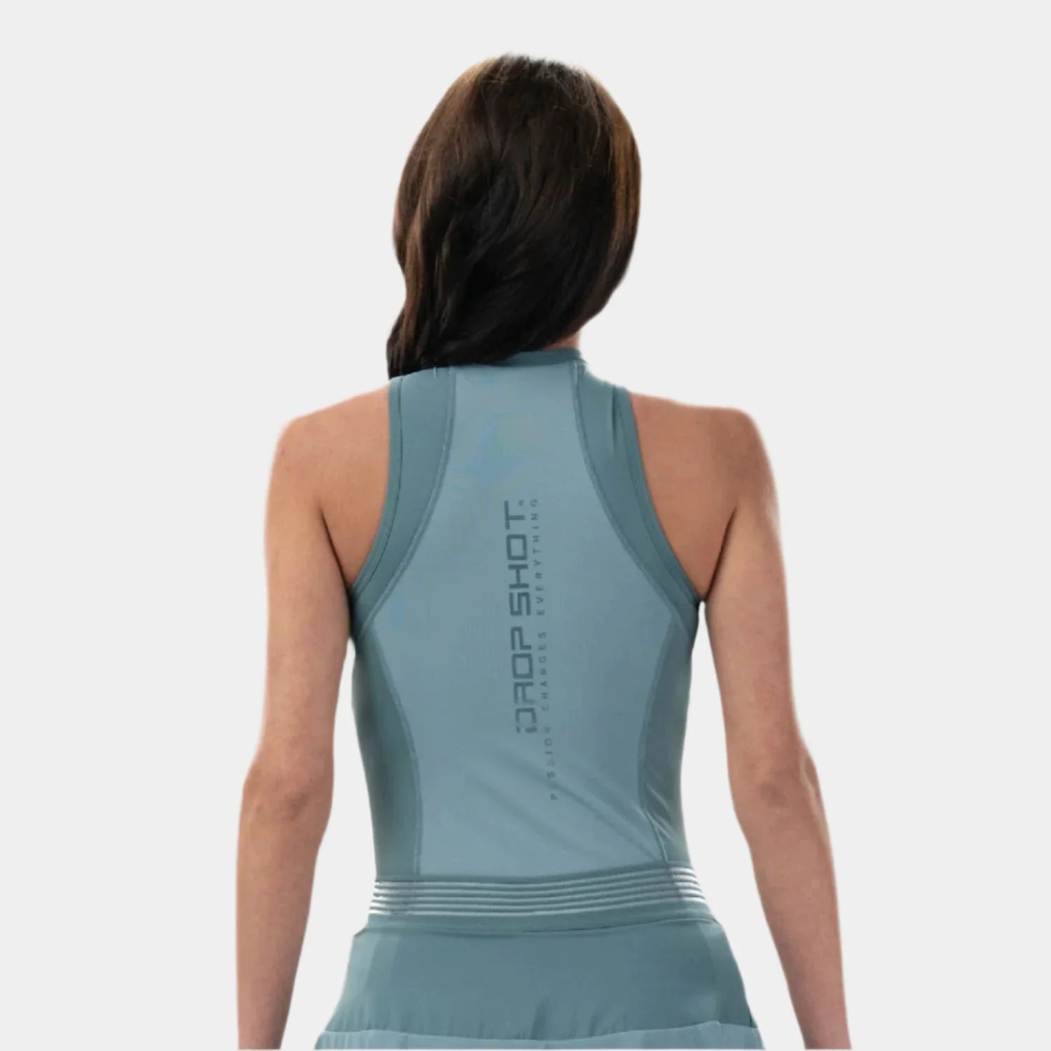 Para su diseño, elegimos un corte estilo traje de baño que permite a los jugadores lucir hombros y espalda. Cuenta con una media cremallera que, además de brindar mayor comodidad y frescura, le da un toque único y personal . La prenda luce el logotipo de la marca estampado en el pecho izquierdo y el nombre Drop Shot estampado verticalmente en la espalda . Los detalles están rematados con un estampado con efecto espejo que le aporta distinción.