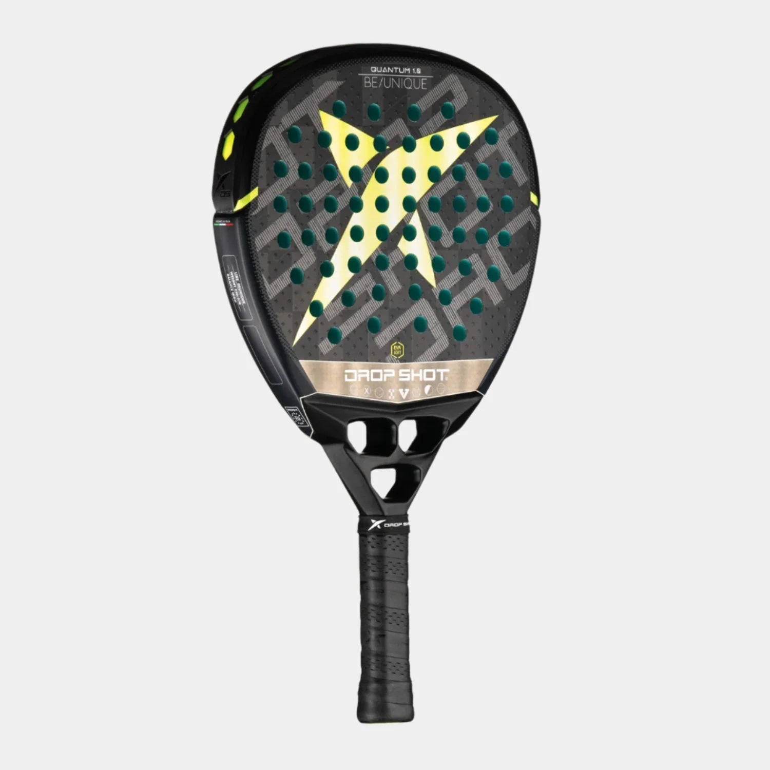 Nuestro modelo se enorgullece de incorporar tecnologías innovadoras y un diseño elegante y contemporáneo; sin embargo, su ADN se mantiene intacto, siendo una pala potente y de alta calidad, diseñada para jugadores que buscan la excelencia en su juego. El diseño presenta forma de lágrima y goma Eva Soft , conocida por su elasticidad y ligereza. Con una menor velocidad de bola, logra mayor potencia. El modelo Quantum 1.0 está construido con carbono de 24.000 filamentos desarrollado por T-Extreme en formato rectangular, lo que permite una mejor flexión y reacción mecánica, produciendo una respuesta más rápida al impacto de la bola. La tecnología de fabricación del carbono utilizada es Spread Tow ; un tejido plano, ultrafino y estable que proporciona mayor control y ligereza, a la vez que proporciona una reacción más rápida al contacto con la bola.