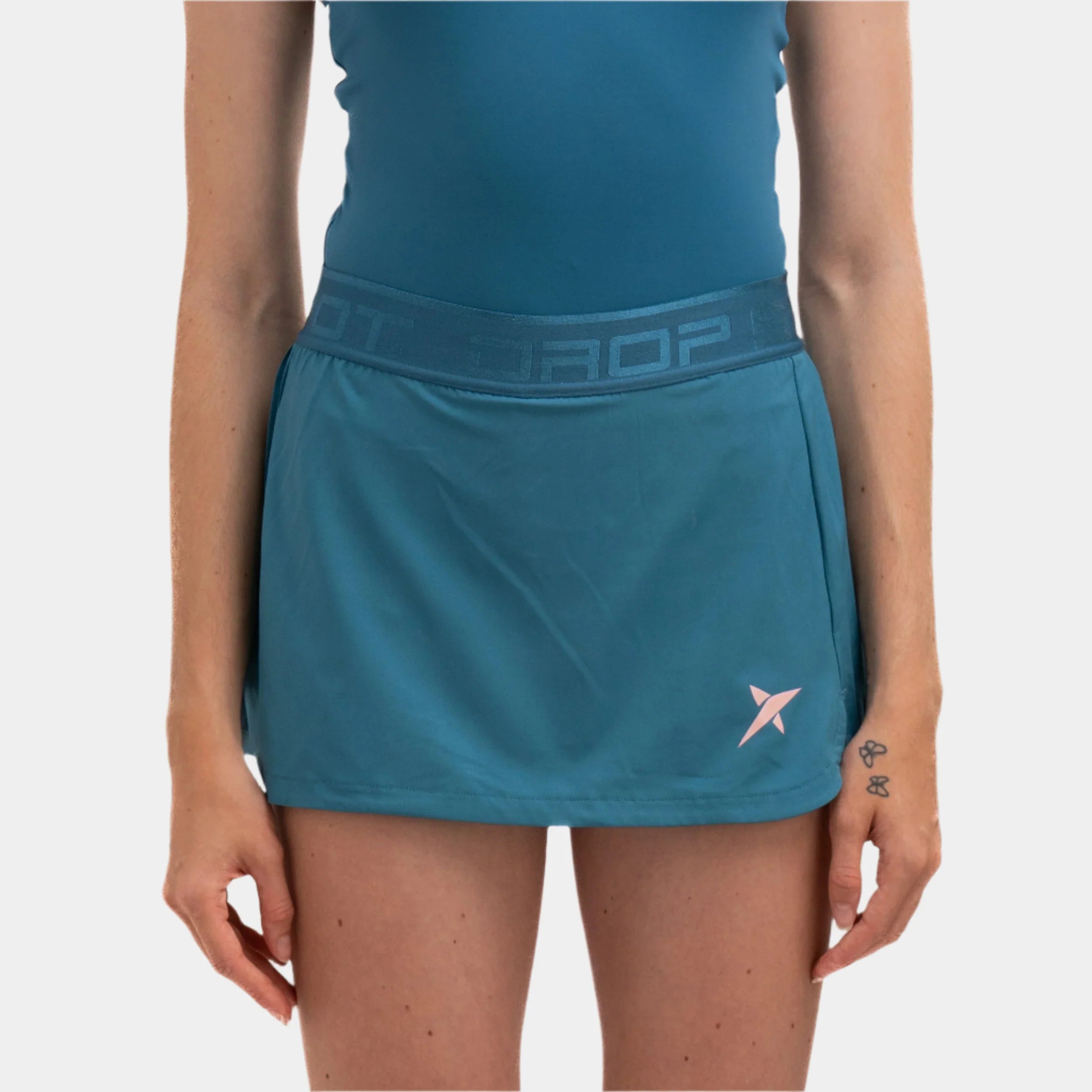 En cuanto a su diseño, la falda Drop Shot Frida está confeccionada en un azul verdoso combinado con un distinguido rosa pálido. La prenda luce un estampado 3D de silicona del logotipo de la marca en la parte inferior delantera.