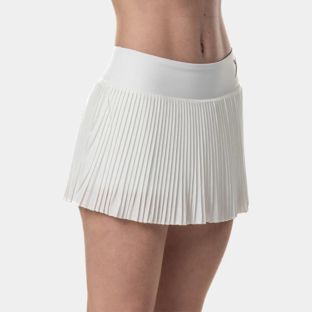 En cuanto a diseño, la Falda Radiant destaca por su elegancia y distinción. Su base blanca brillante la convierte en una pieza destacada, mientras que su estructura plisada le aporta carácter y movimiento. El logotipo de Drop Shot está impreso en silicona 3D rosa, lo que le aporta personalidad y valor.