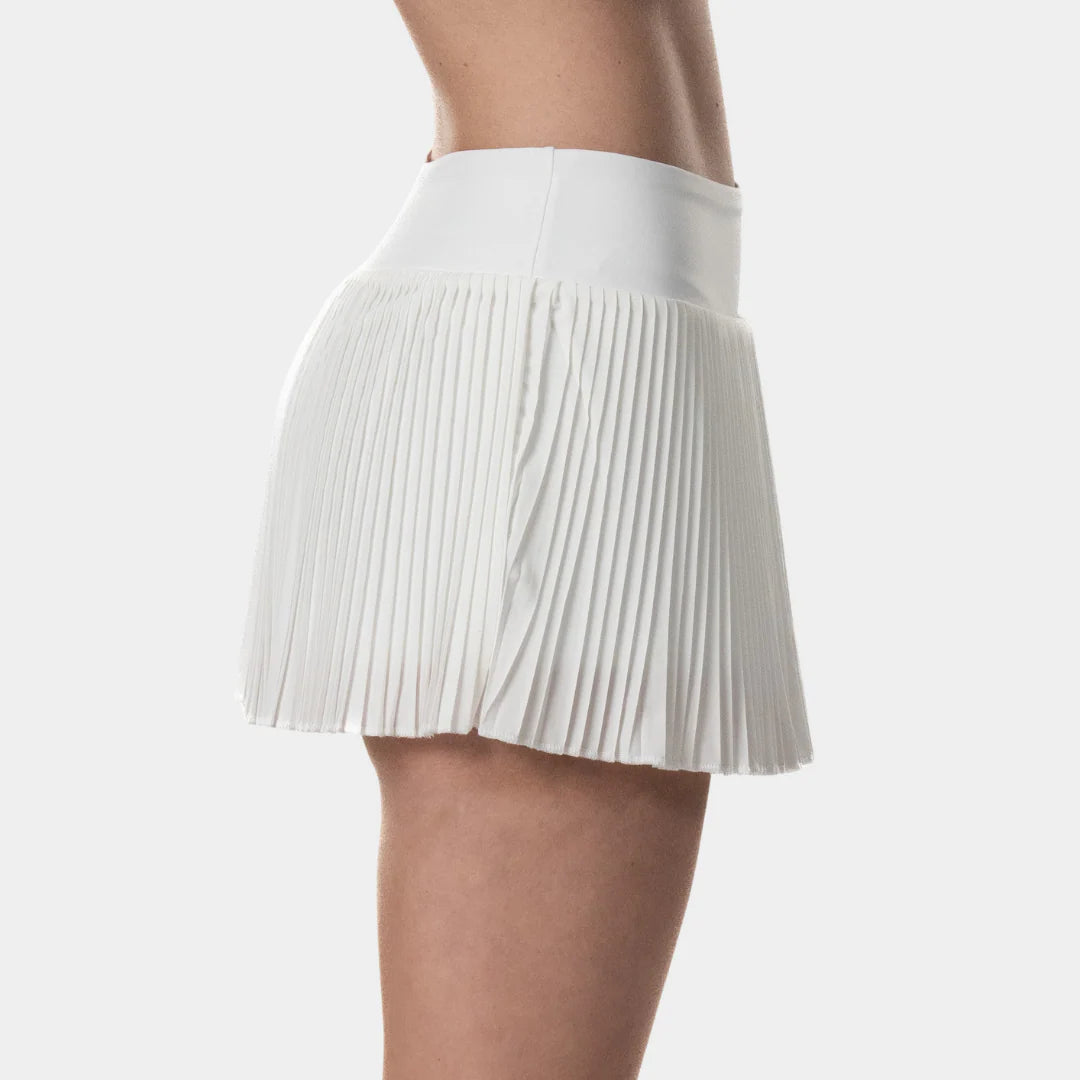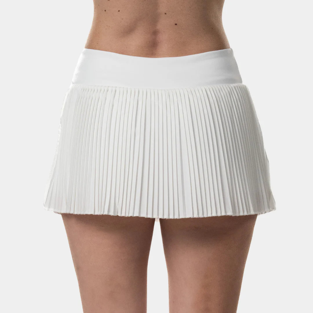 En cuanto a diseño, la Falda Radiant destaca por su elegancia y distinción. Su base blanca brillante la convierte en una pieza destacada, mientras que su estructura plisada le aporta carácter y movimiento. El logotipo de Drop Shot está impreso en silicona 3D rosa, lo que le aporta personalidad y valor.