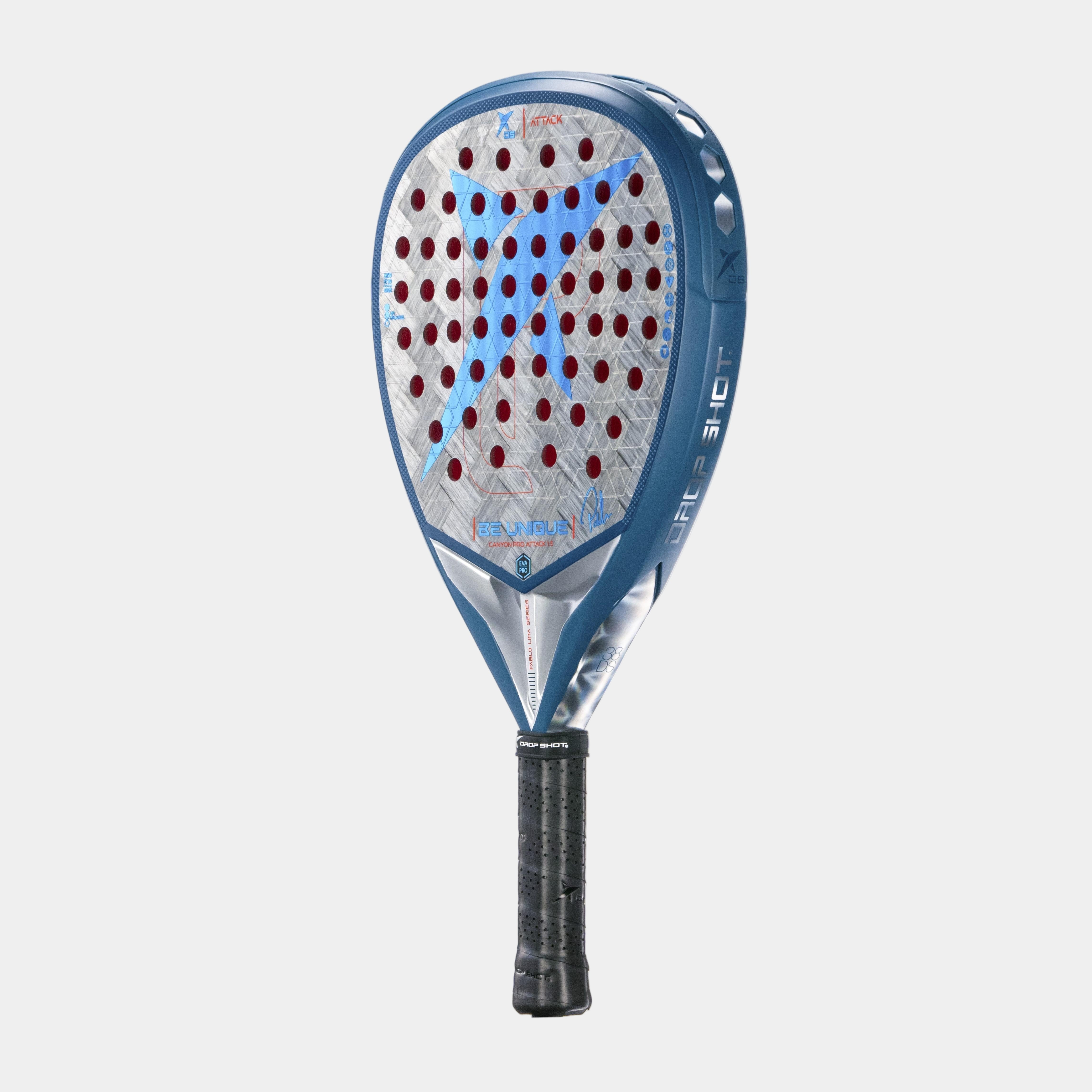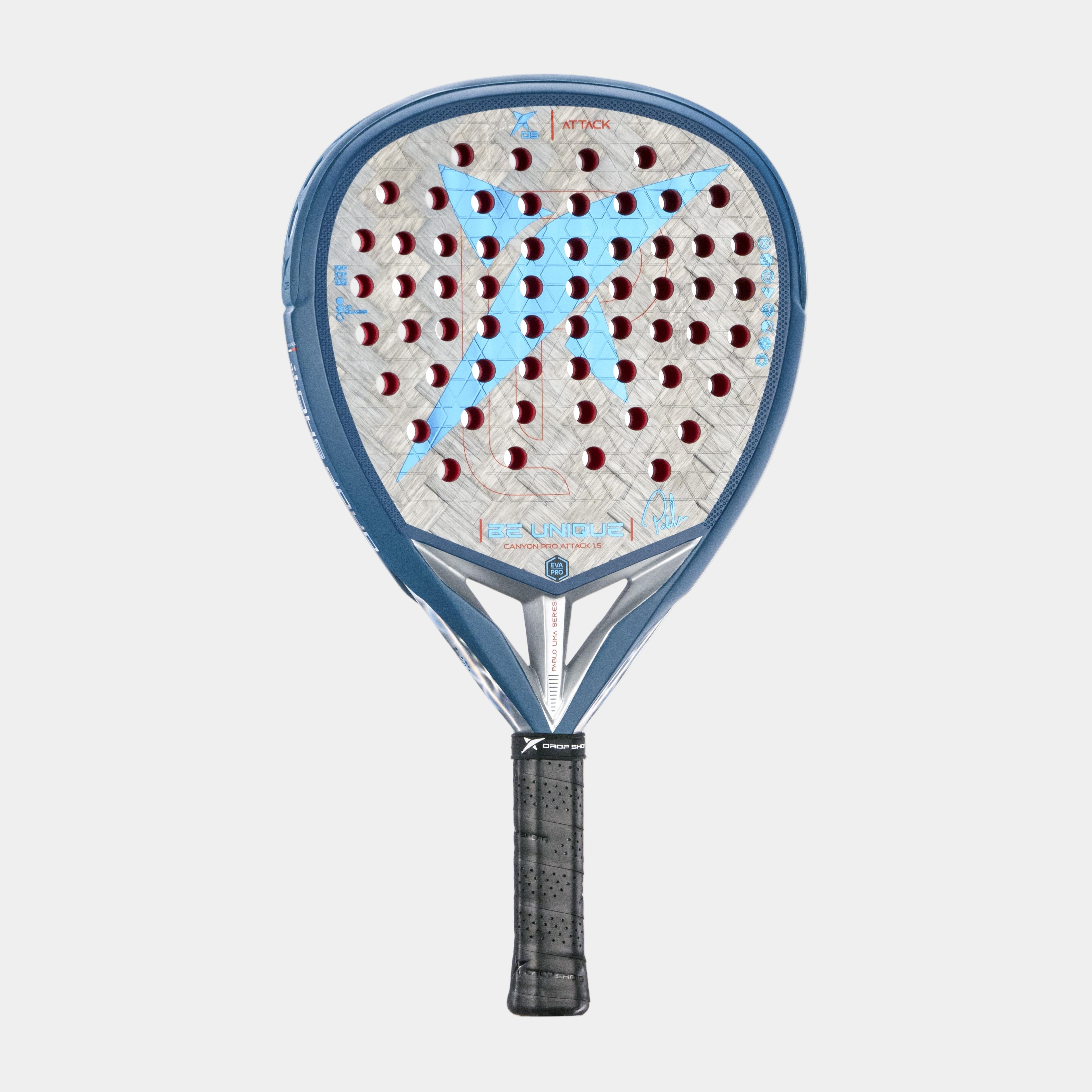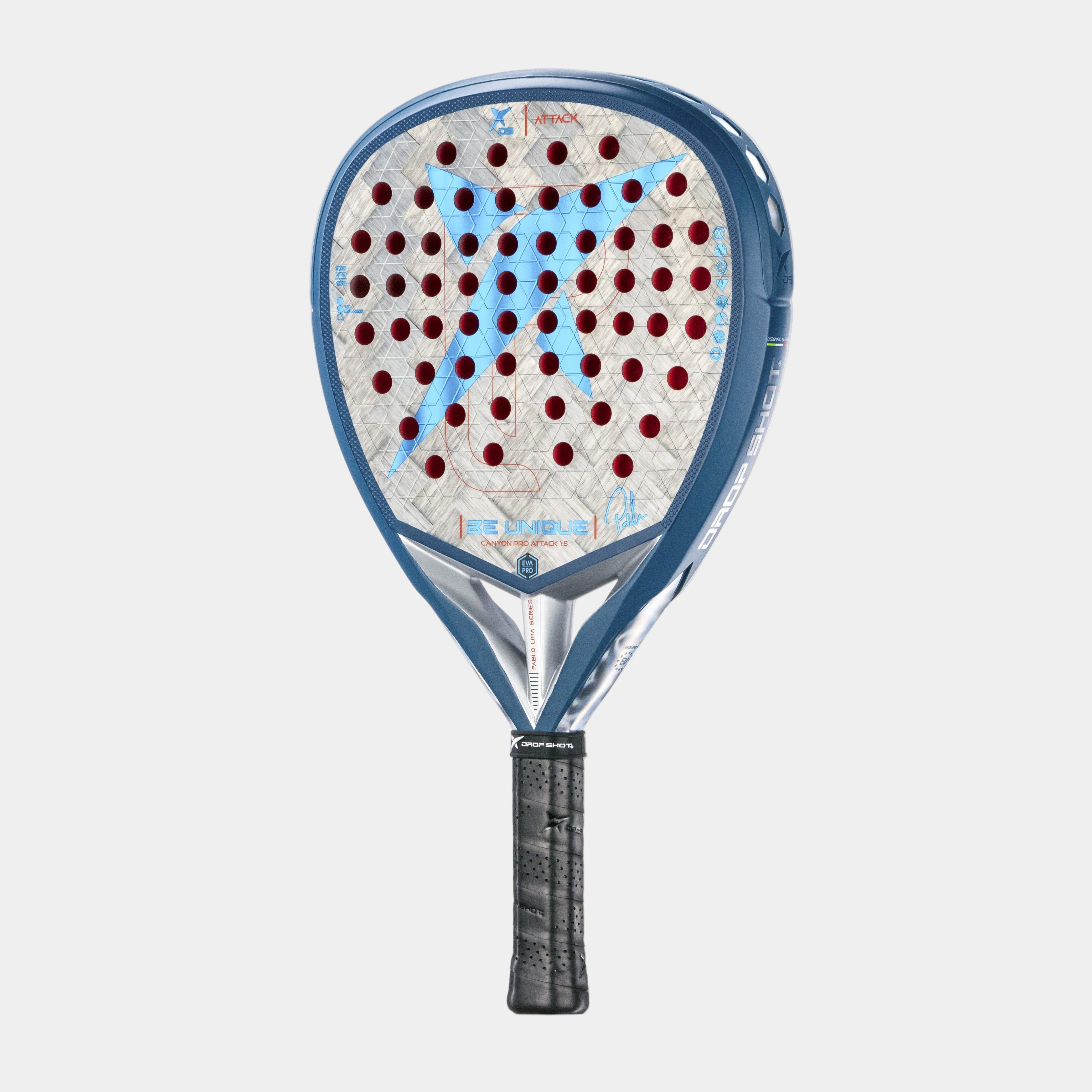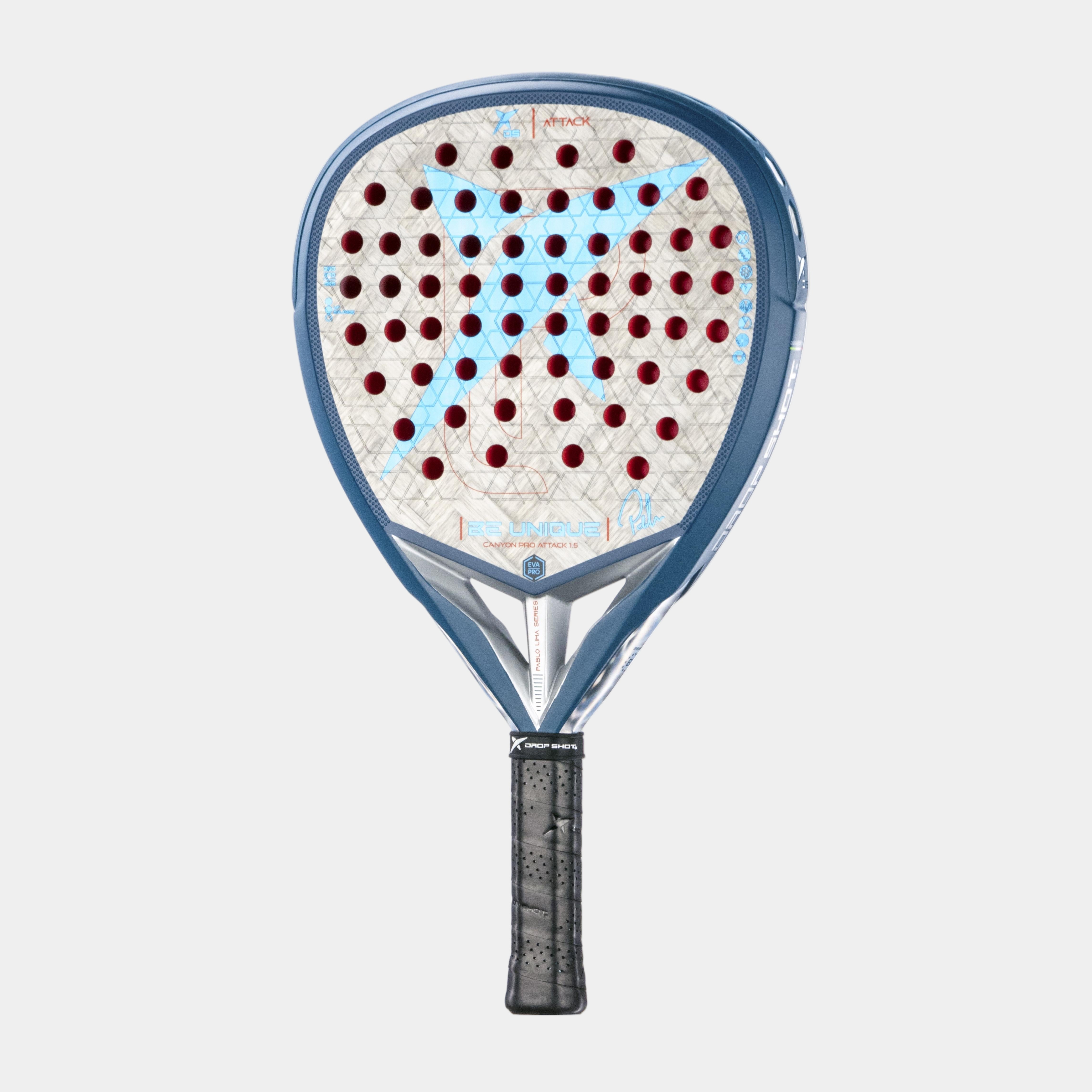 La Pala Drop Shot Canyon Pro Attack 1.5 ha diseñado con un molde de diamante, ideal para aquellos jugadores de nivel avanzado y que buscan desplegar un juego potente. Su balance es alto y el peso se inclina hacia la cabeza. La goma de su interior es Eva Pro, una goma cuya principal propiedad es la sensación de control. Sus caras se componen de Carbono 24K Twill; un carbono de última generación de 24.000 filamentos por cada hilo de carbono. Se trata de un entretejido tipo sarga flexible y resistente. Se caracteriza por ser plano, extra fino y flexible, lo cual proporciona un mayor control y ligereza, produciendo una reacción más rápida al momento del golpeo con la pelota.