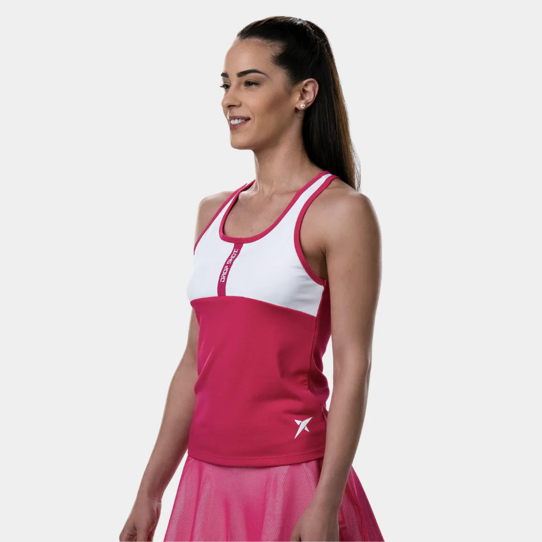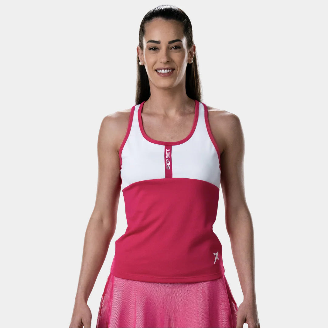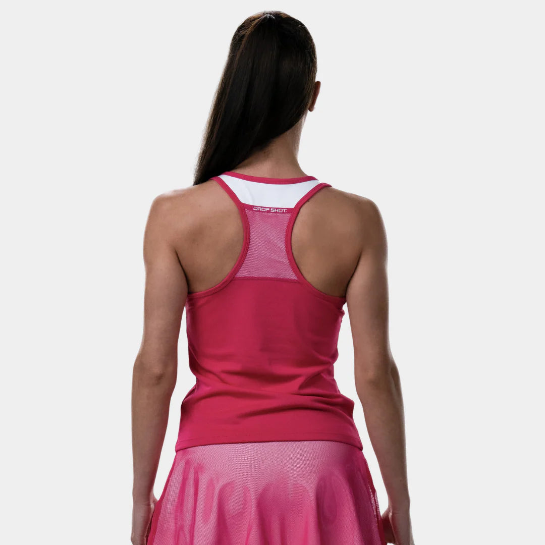La camiseta de tirantes Drop Shot Azalea es una de las más vendidas de la temporada. Su diseño en tonos rosas se ha convertido en tendencia estrella de la primavera-verano entre los jugadores de pádel.